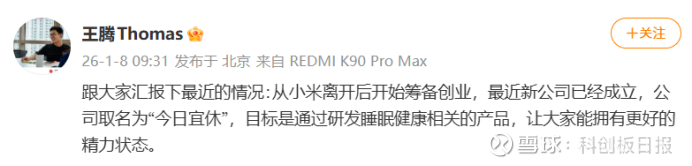 今日,小米前高管王腾在个人微博发文透露创业新动态。据其所述,从小米离开后开始筹备创业,最近新公司已经成立,公司取名为“今日宜休”,目标是通过研发睡眠健康相关的产品。