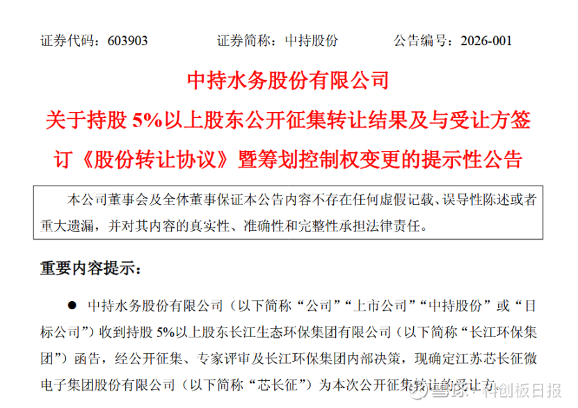 根据公告细节,1月5日长江环保集团与江苏芯长征微电子集团股份有限公司(下称“芯长征”)签署《股份转让协议》,约定前者向后者转让所持中持股份6313.3万股无限售流通股,占公司总股本的24.73%,转让价格为9.2元/股。