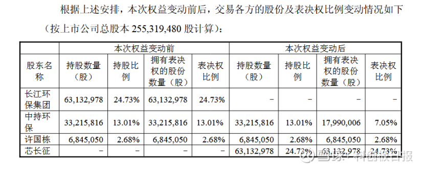交易完成前,中持股份无控股股东及实控人,长江环保集团为第一大股东;交易完成后,长江环保集团将彻底退出,芯长征以24.73%持股成为第一大股东,结合上述表决权放弃及承诺安排,正式取得公司控股权。