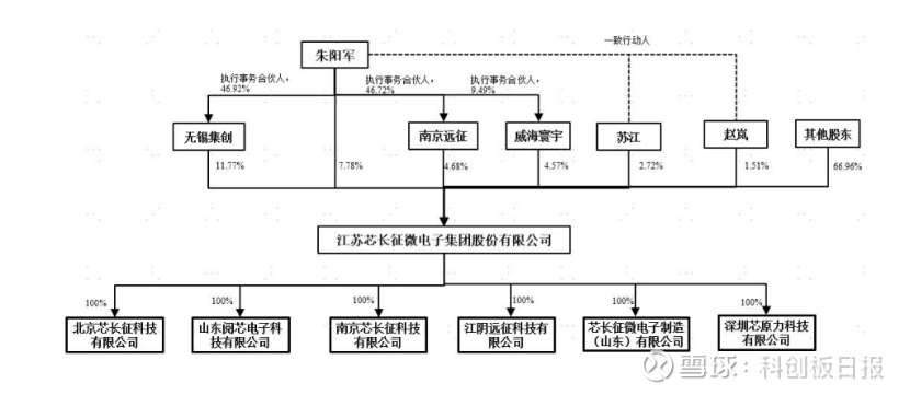 股权结构上,芯长征无控股股东,朱阳军直接持有芯长征7.78%股份,并通过担任无锡集创、威海寰宇、南京远征分别控制芯长征 11.77%、4.57%和 4.68%表决权,通过与苏江、赵岚签署的《一致行动协议》分别控制芯长征 2.72%和 1.51%的表决权,合计控制芯长征 33.04%的表决权,为芯长征的实际控制人。