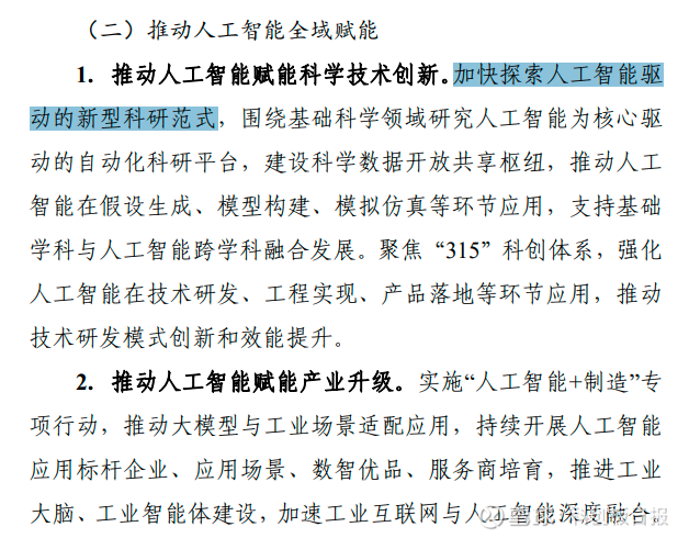 推动人工智能赋能科学技术创新。加快探索人工智能驱动的新型科研范式,围绕基础科学领域研究人工智能为核心驱动的自动化科研平台,建设科学数据开放共享枢纽,推动人工智能在假设生成、模型构建、模拟仿真等环节应用,支持基础学科与人工智能跨学科融合发展。聚焦“315”科创体系,强化人工智能在技术研发、工程实现、产品落地等环节应用,推动技术研发模式创新和效能提升。