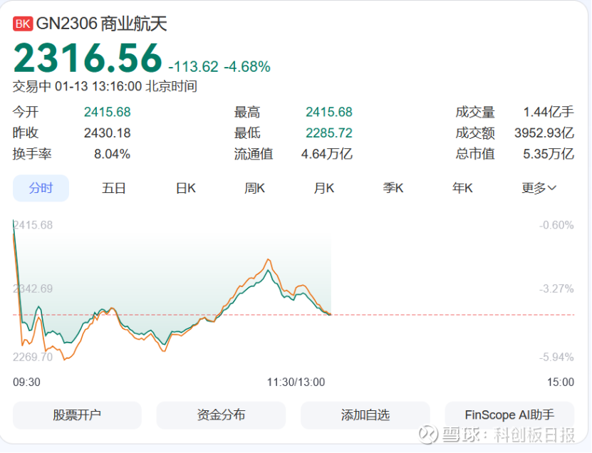 《科创板日报》1月13日讯(记者 吴旭光) 今日(1月13日),此前连涨多日的商业航天概念股开盘集体走跌,板块现调整。