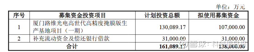 项目分阶段实施,本次募集资金投资项目为“厦门路维光电高世代高精度掩膜版生产基地项目(一期)”,预计建设周期为33个月,计划总投资13.01亿元,其中拟投入募集资金10.70亿元。