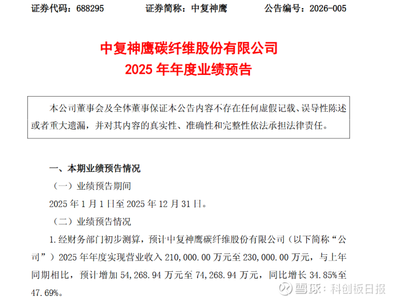 《科创板日报》1月28日讯(记者 吴旭光) 1月28日晚间,中复神鹰发布公告,预计2025年实现营业收入21亿元至23亿元,同比增长34.85%-47.69%;公司预计实现归母净利润8000万元至1.2亿元,上年同期亏损1.24亿元,相较上年同期将实现扭亏为盈。