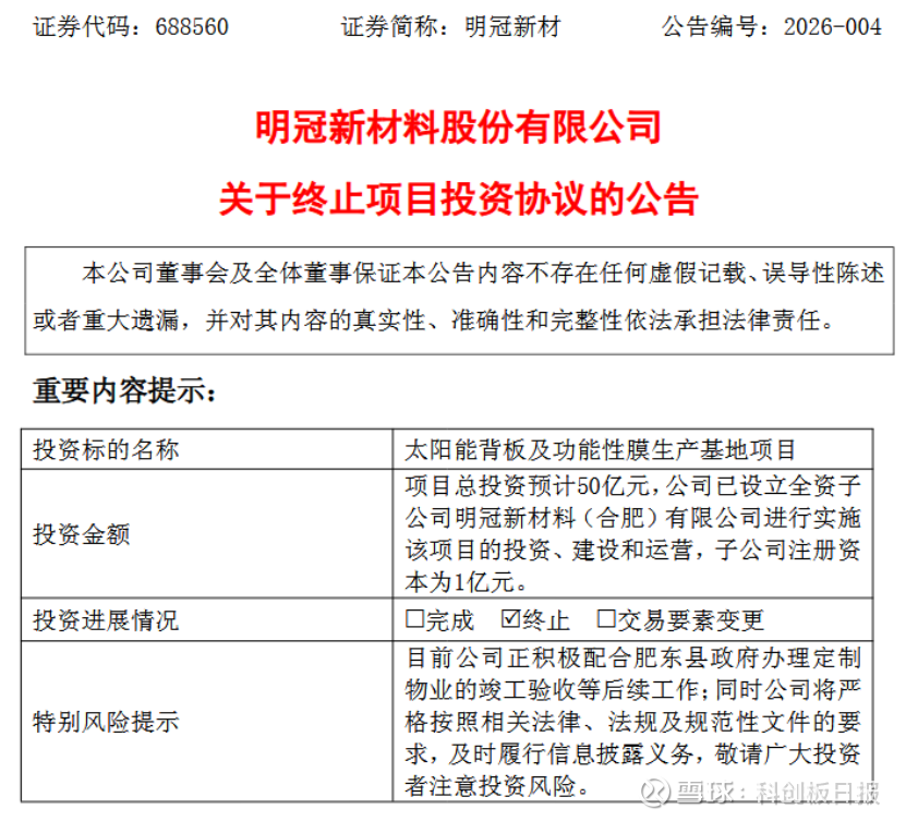 《科创板日报》2月9日讯(记者 吴旭光) 历时三年,明冠新材百亿级光伏封装材料项目按下终止键。