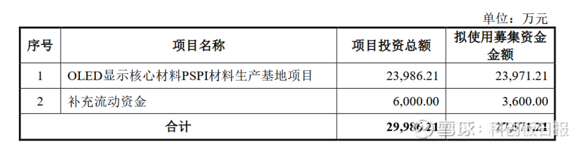 募集资金投向方面,其中,2.4亿元用于OLED显示核心材料PSPI材料生产基地项目,0.6亿元用于补充流动资金。