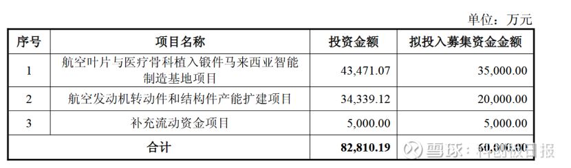 其中,拟募资金额最高的为航空叶片与医疗骨科植入锻件马来西亚智能制造基地项目。