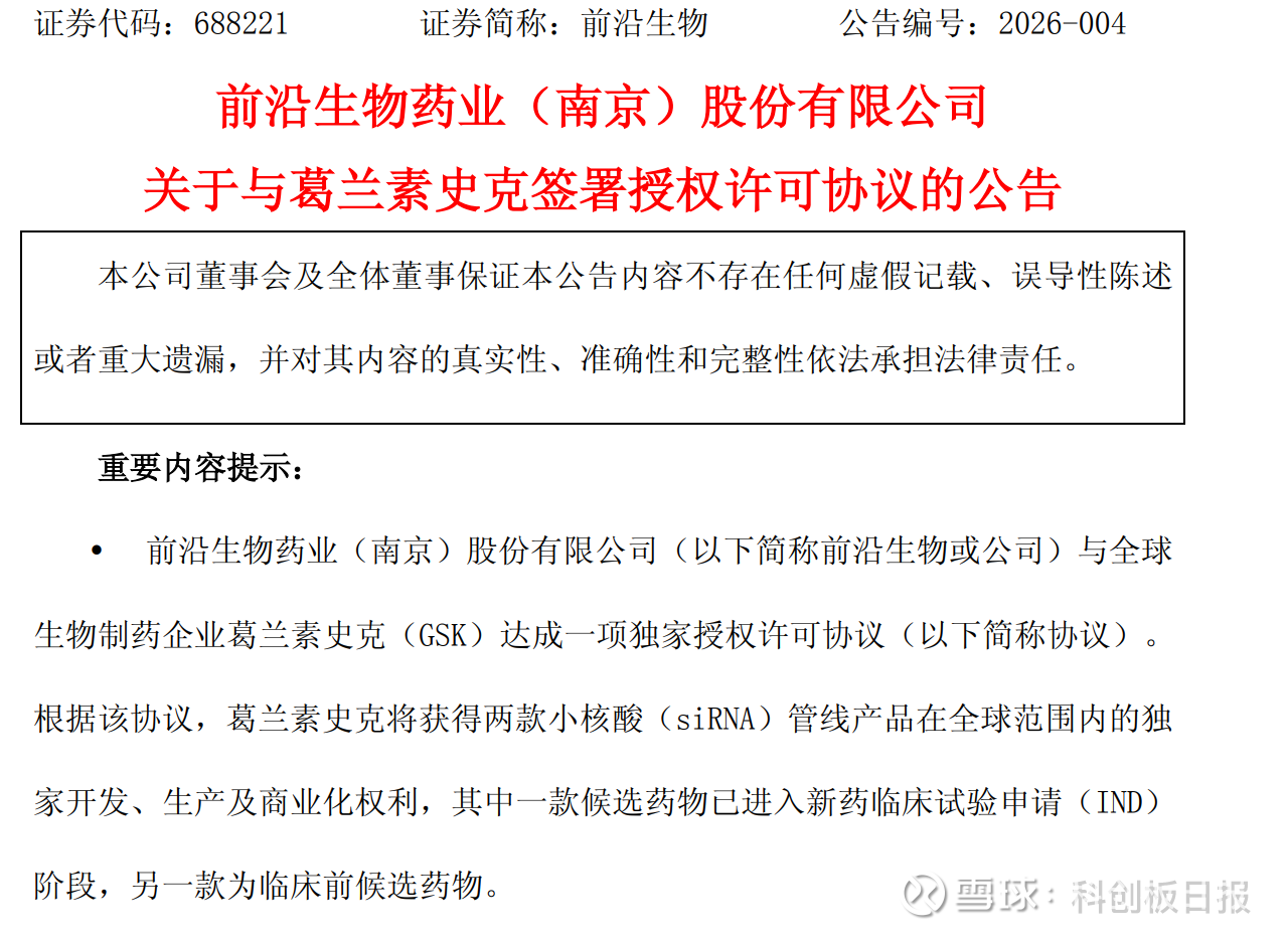 《科创板日报》2月24日讯(记者 史士云)2月23日,前沿生物(688221.SH)发布公告称已与葛兰素史克(GSK)达成一项独家授权许可协议。