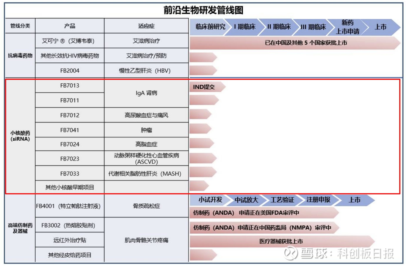 截至目前,前沿生物旗下已囊括了多款小核酸药物,其中,在IgA肾病疾病领域,针对补体系统中的单靶点小核酸药物FB7013已向国家药监局提交IND申请并获得受理,双靶点小核酸药物FB7011则已进入新药临床试验申请支持性研究阶段。