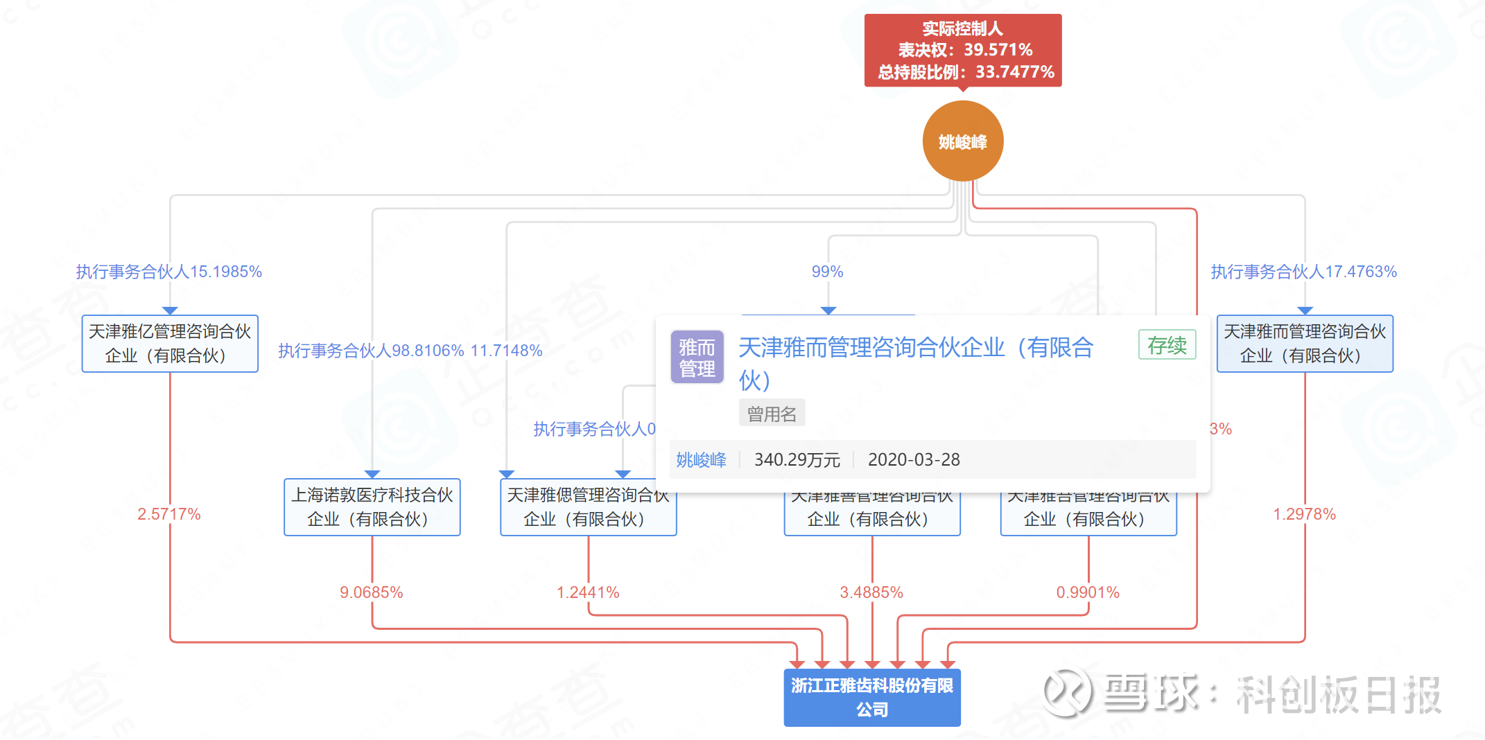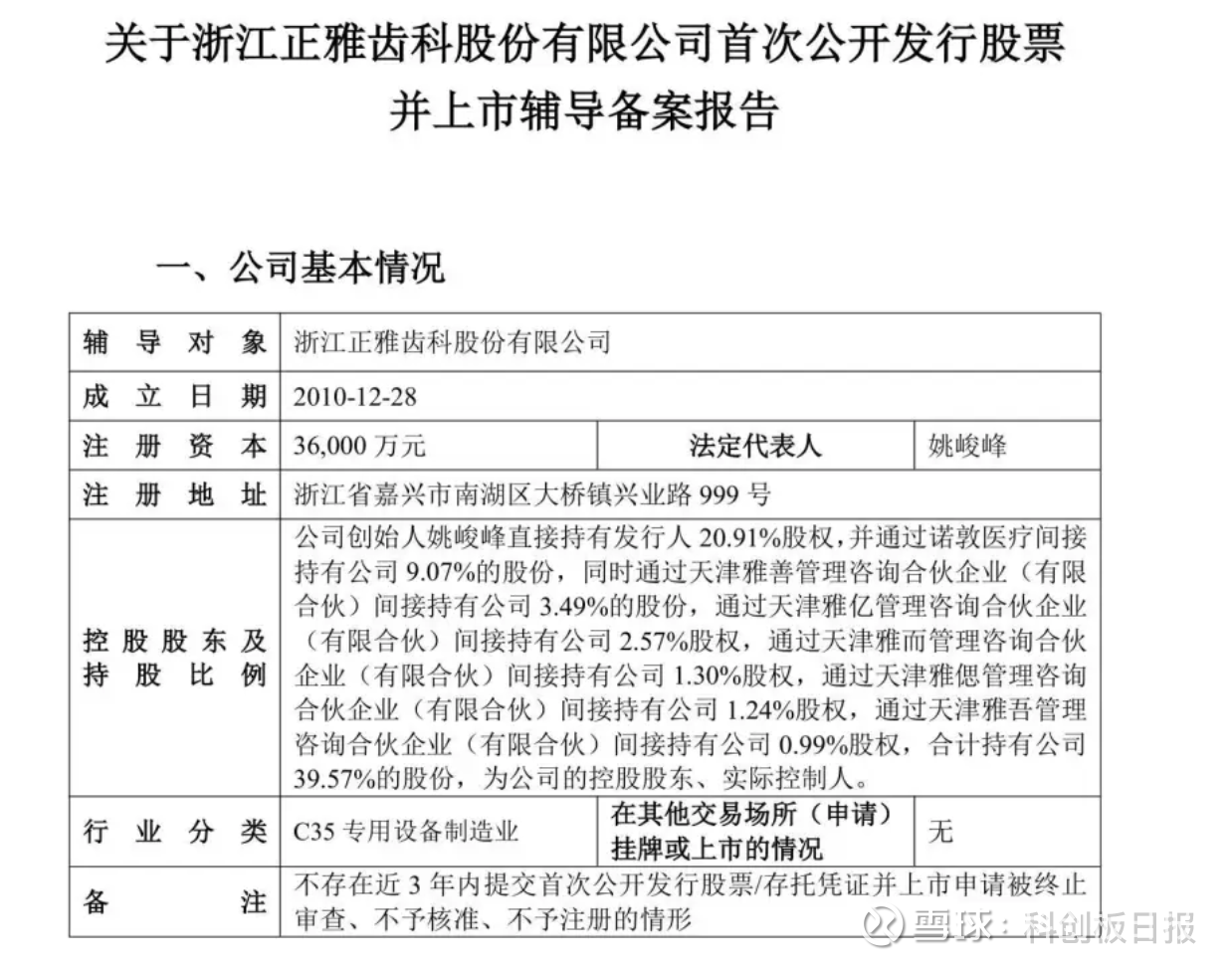 另据辅导备案报告显示,正雅齿科创始人姚峻峰直接持有公司20.91%的股权,并通过诺敦医疗、天津雅善管理咨询合伙企业(有限合伙)、天津雅亿管理咨询合伙企业(有限合伙)、天津雅而管理咨询合伙企业(有限合伙)、天津雅偲管理咨询合伙企业(有限合伙)、天津雅吾管理咨询合伙企业(有限合伙)分别间接持股9.07%、3.49%、2.57%、1.30%、1.24%、0.99%,合计持股39.57%,为公司控股股东及实际控制人。