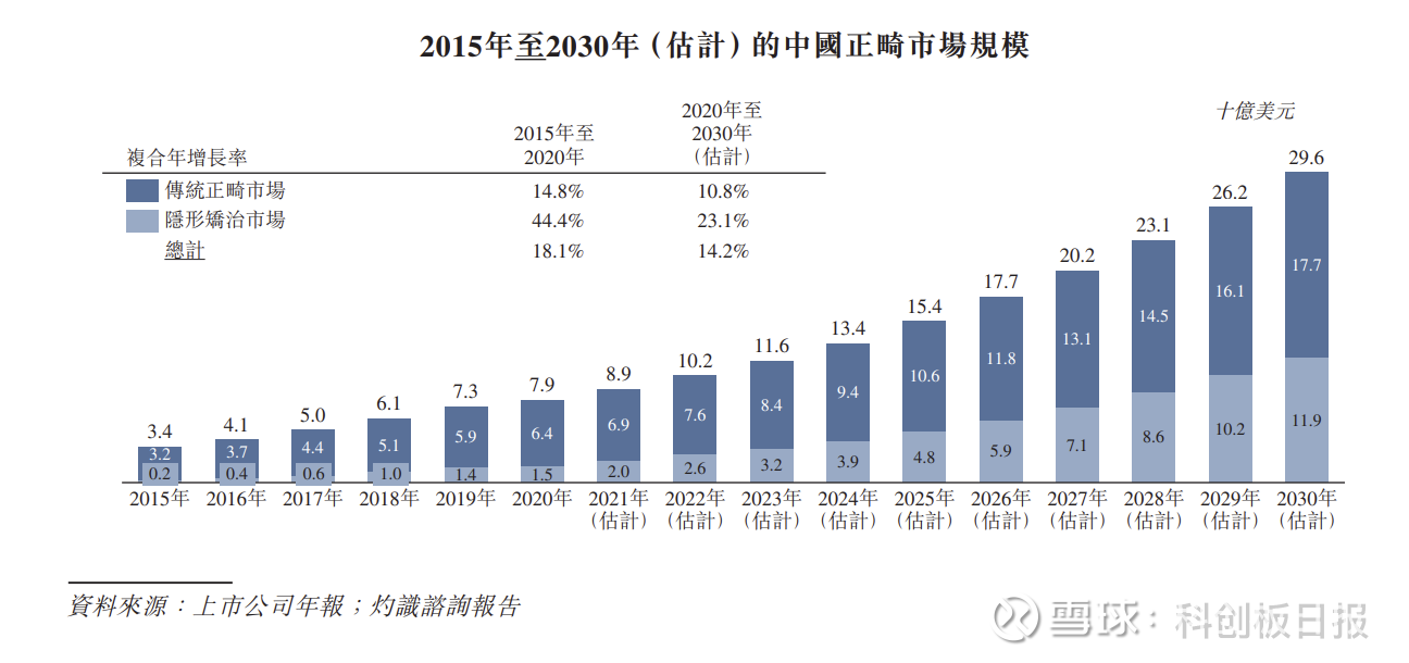 根据灼识咨询数据,中国隐形矫治市场已于2019年跃居全球第二大市场。按零售销售收入计,市场规模从2015年的2亿美元增长至 2020年的15亿美元,预计到2030年将进一步扩容至119亿美元,2020—2030年期间复合年增长率约为23.1%。