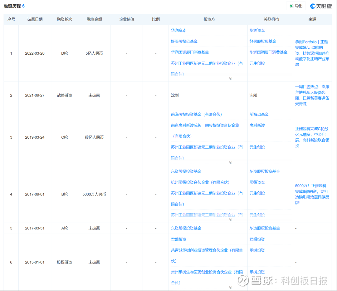 在启动上市辅导前,正雅齿科已完成多轮融资。天眼查数据显示,2015年1月,正雅齿科完成了首轮股权融资,投资方包括承树投资、君盛投资。2017年3月,正雅齿科又获得了A轮融资,投资方为东资股权投资基金,该资本机构又参与了公司的B轮融资。