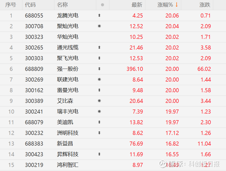 《科创板日报》3月5日讯3月5日,MicroLED概念开盘活跃。截至午间,A股涨幅榜前列大多数席位被“光电”包揽,龙腾光电、聚灿光电、华灿光电、通光线缆、聚飞光电、雷曼光电、艾比森等MicroLED概念股20CM涨停。