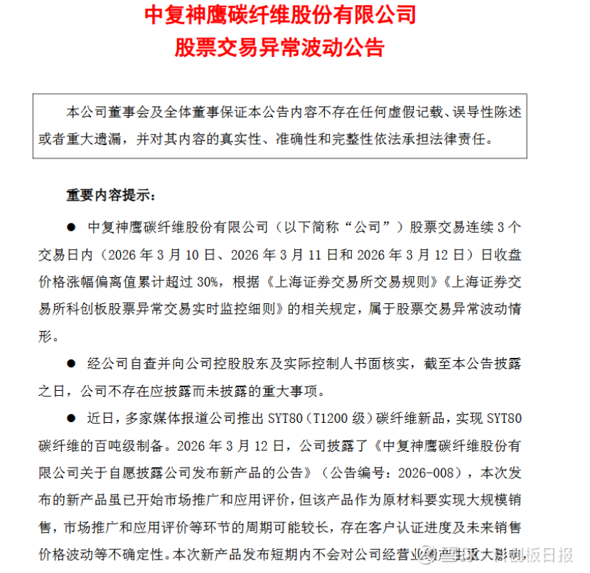 3月12日晚间,中复神鹰提示,公司股价短期波动幅度较大,请广大投资者注意二级市场交易风险。