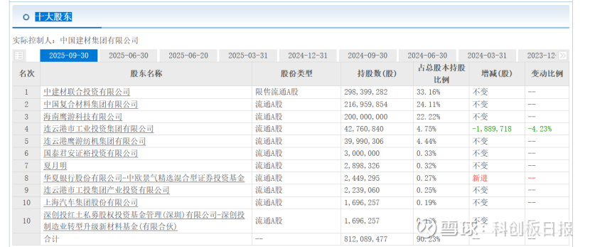 十大股东方面,截至2025年9月30日,中复神鹰实际控制人为中国建材集团有限公司,前十大股东合计持股8.12亿股,占总股本90.23%。