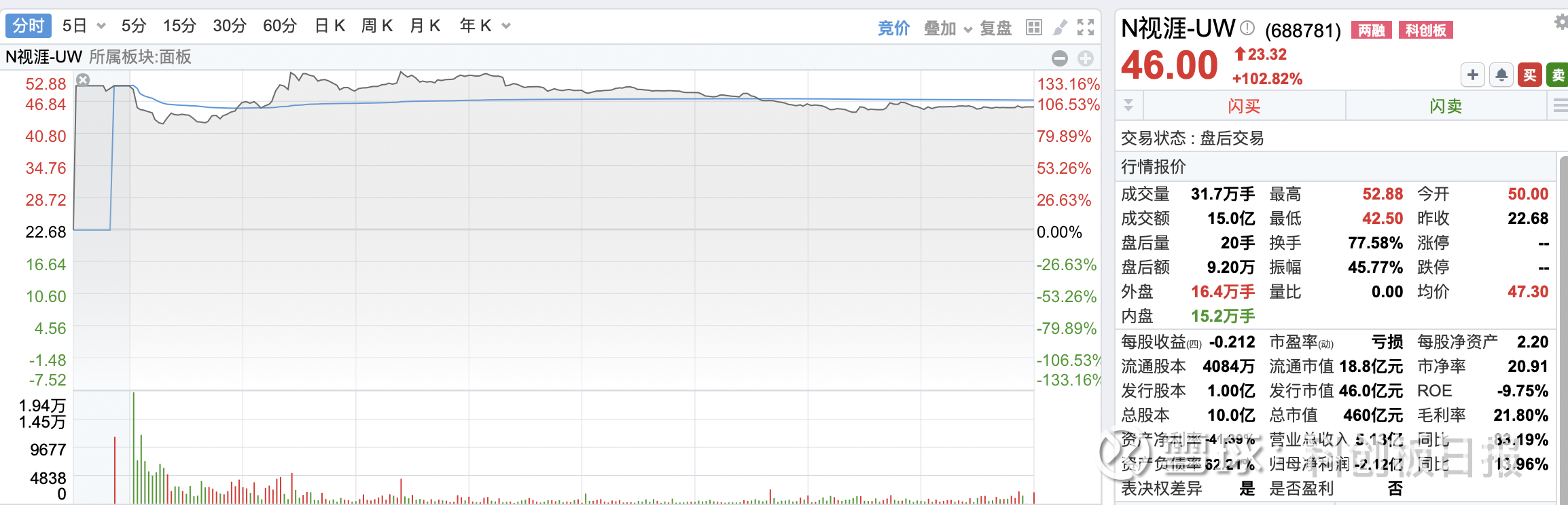 《科创板日报》3月25日讯(记者 黄修眉)硅基OLED巨头视涯科技今日(3月25日)以22.68元/股的发行价登陆科创板,上市首日以50元/股价格开盘,最终股价报收46元/股,涨幅达102.82%,最新总市值460亿元。