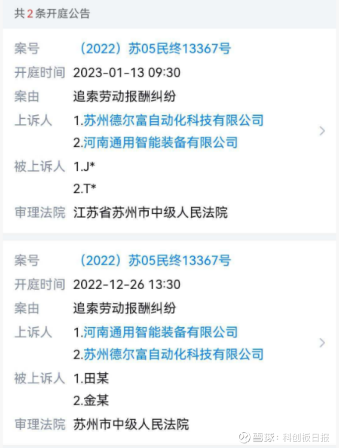据开庭公告信息,两起案件的上诉人均为苏州德尔富自动化科技有限公司、河南通用智能装备有限公司,被上诉人为田某、金某,分别于2022年12月26日、2023年1月13日开庭审理,案由均为追索劳动报酬纠纷。