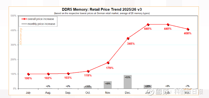 来自硬件价格监测机构3DCenter的最新数据显示,2026年3月,德国市场DDR5内存零售均价环比下跌7.2%,价格指数从2025年7月为基准的440%回落至408%,为连续8个月上涨后的首次月度下跌。
