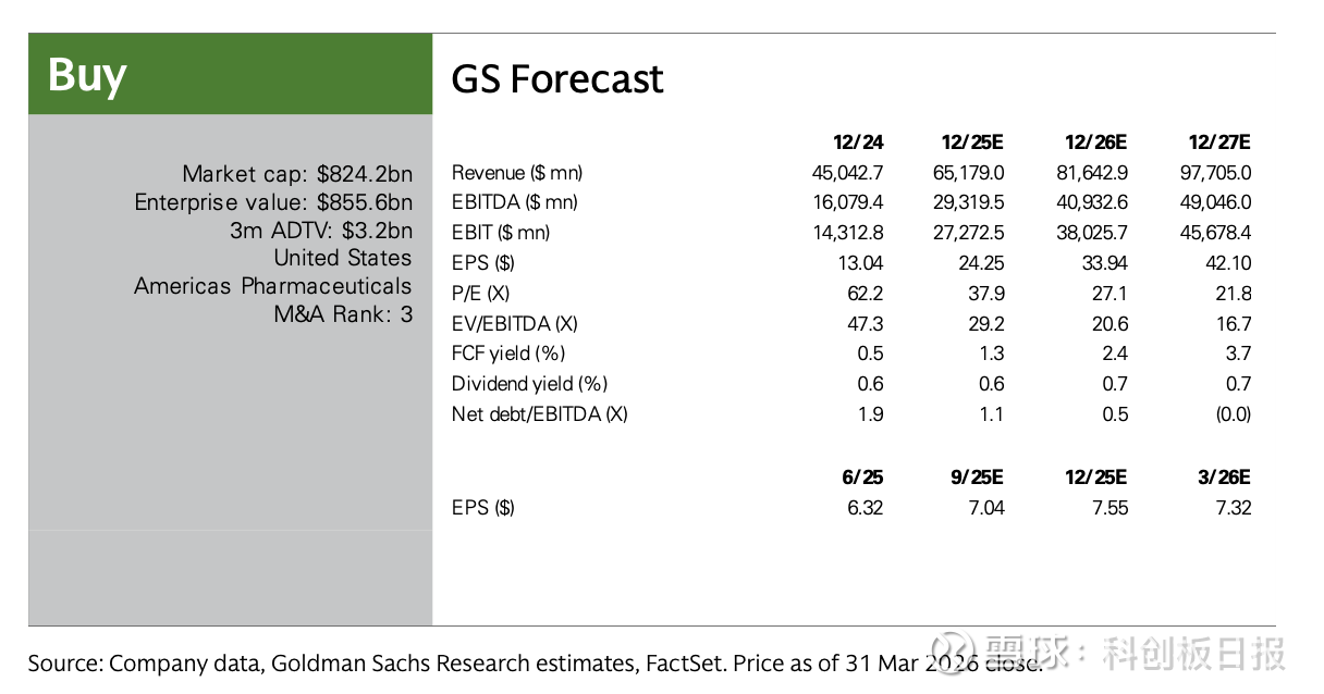 高盛预计,礼来2026年全年营收将达到816.43亿美元,EPS(每股收益)为33.93美元:2027年全年营收为977.05亿美元,EPS达到42.10美元。