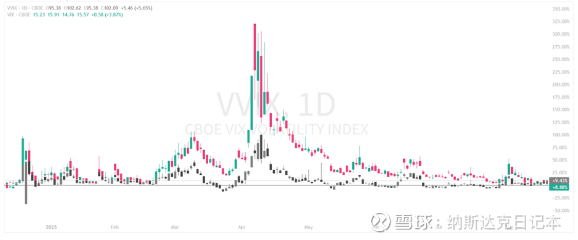 VIX目前维持在15附近,整体仍处低位,仅显示市场短期波动预期温和,但VVIX已升至102并大幅走高,反映投资者对未来波动性的担忧正在升温,暗示美股短线虽未出现恐慌情绪,却可能酝酿更大的震荡风险。