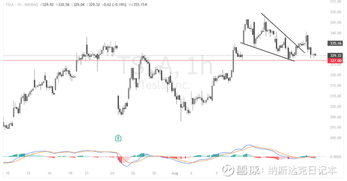 特斯拉(TSLA)1小时图显示,股价近期在345美元附近遇阻后回落,并于327美元形成短期支撑,当前在329–335美元区间震荡整理。从形态上看,前期已完成一个下降楔形的突破,但后续上攻动能不足,导致股价重新回踩支撑。MACD动能趋弱,短线多空胶着。