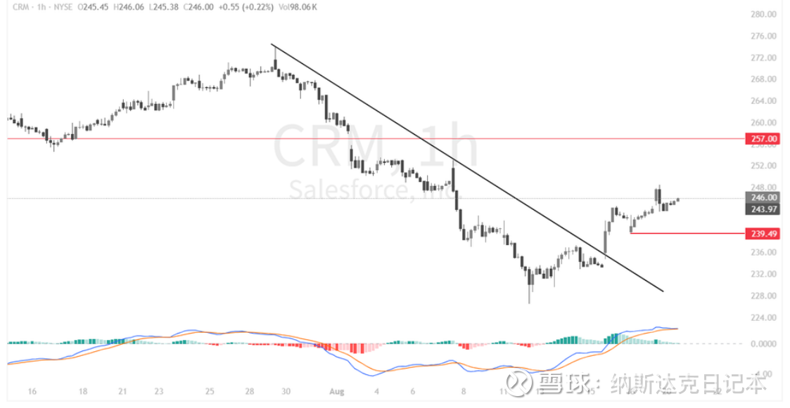 Salesforce(CRM)1小时图显示,股价在经历一波持续下跌后,于约230美元附近企稳,并成功突破下降趋势线,短期技术面出现修复信号。目前股价回升至246美元附近,MACD维持在零轴上方,动能偏多。