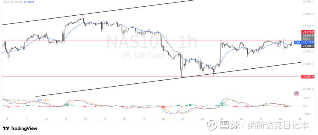 1小时图显示,Nas100 当前仍运行在 23,575 压力位下方。该水平为近期震荡区间的关键分水岭,若指数能突破并企稳于其上,将有望打开进一步上涨空间,延续中短期多头趋势;反之,若多次上攻未果,短线仍可能维持震荡并伴随回踩。