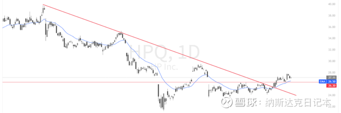 日线图显示,惠普股价在经历长时间下跌后进入底部震荡阶段。近期价格突破震荡区间上沿,并企稳于 20 日均线(20EMA)之上,表明下行动能已逐渐衰竭,趋势可能正由底部盘整转向上升通道。若能继续放量上攻,将进一步确认反转信号。