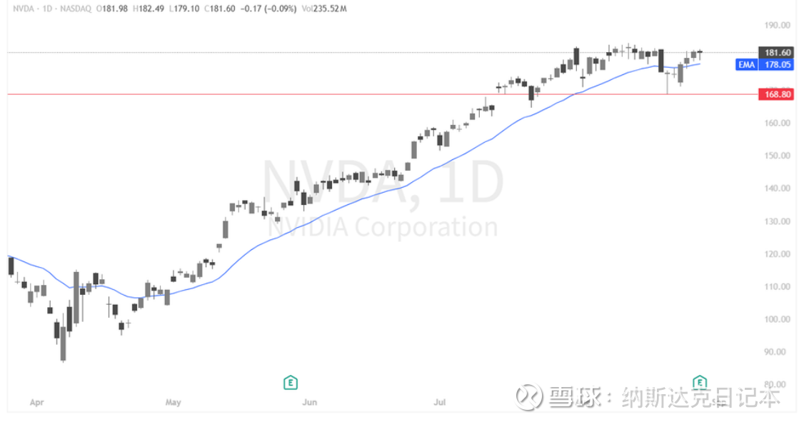 英伟达盘前下跌约 2%,目前股价报 181.6 美元,与周四持平。短线自历史高点回落至约 176 美元,刚好触及 20 日均线(EMA20)支撑,显示支撑有效且长期上升趋势仍完好。若股价不跌破上周三低点,多头趋势仍然成立。