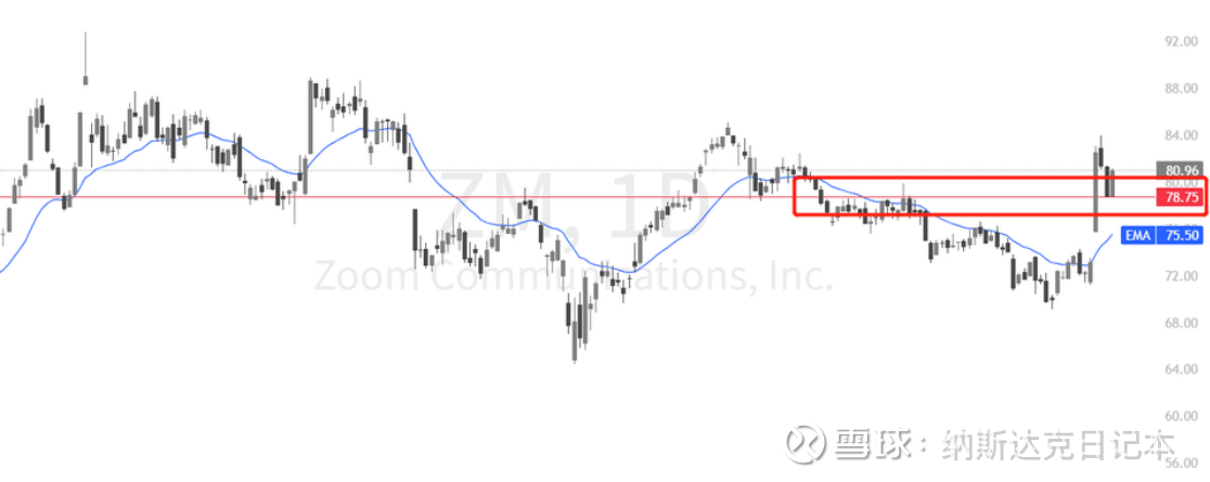 ZM(Zoom Video Communications, Inc.)日线图显示,股价此前经历明显回调,近期已出现反弹迹象。当前价格回升至指数移动平均线(EMA)上方,短期多头力量增强。同时,股价在反弹过程中成功突破了此前关键阻力位(红色横线位置),这一技术突破为后续反弹提供支撑,是一个积极信号。