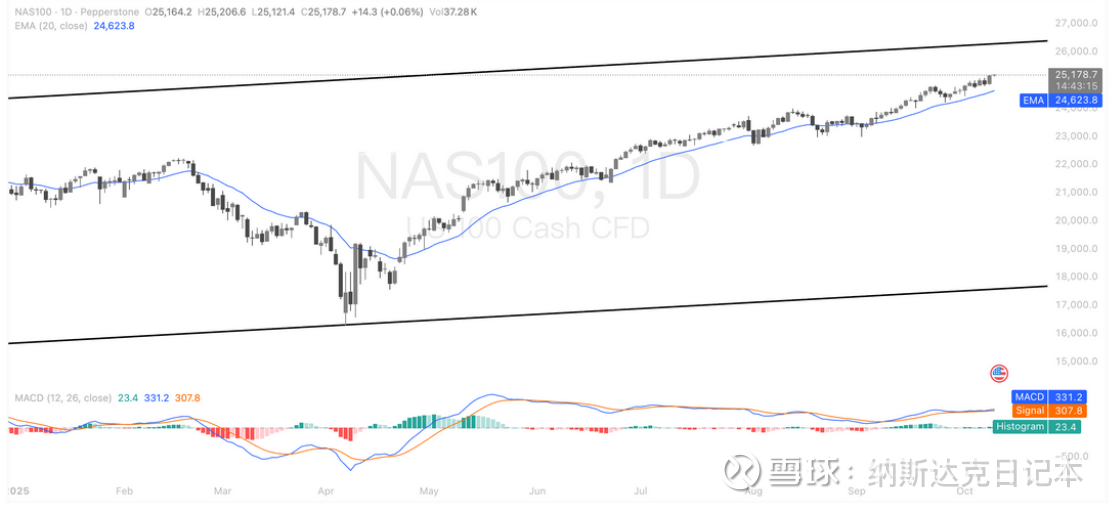 NAS100 整体呈强劲上升趋势,20 日 EMA 均线持续提供支撑,MACD 指标也显示多头占优。当前价格临近 25000 关键阻力位,若能有效突破,在多头情绪延续及量能配合下,有望进一步挑战 26000。