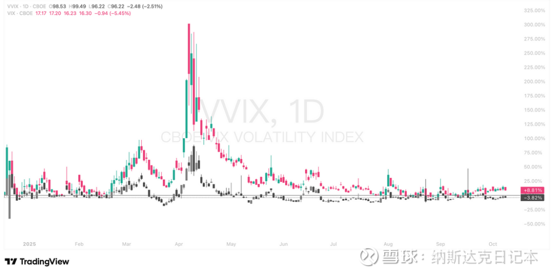 昨日,作为衡量市场恐慌情绪关键指标的 VIX(芝加哥期权交易所波动率指数,即 “恐慌指数”),以及反映 VIX 自身波动率预期的 VVIX(CBOE 波动率指数)均出现明显回调。VIX 当日下跌 0.94,跌幅达 5.45%;VVIX 也下跌 2.48,跌幅为 2.51%。从相关日线图走势来看,此前市场曾有过波动,但近期 VIX 和 VVIX 的回调态势,反映出投资者对市场风险的担忧有所缓解,市场风险偏好正持续抬升,这可能意味着投资者更愿意投入风险资产,对市场后续表现抱有相对积极的态度,不过后续市场情绪是否能持续向好,仍需结合更多宏观经济数据、政策动态等因素进一步观察。