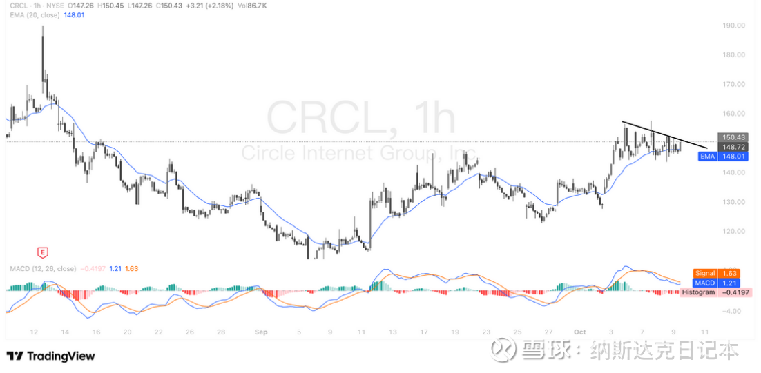 技术面来看,CRCL 近期走势颇为强劲,价格持续攀升且稳稳处于关键支撑位上方,市场买盘力量逐步增强,若能突破150美元,将打开进一步上涨空间。