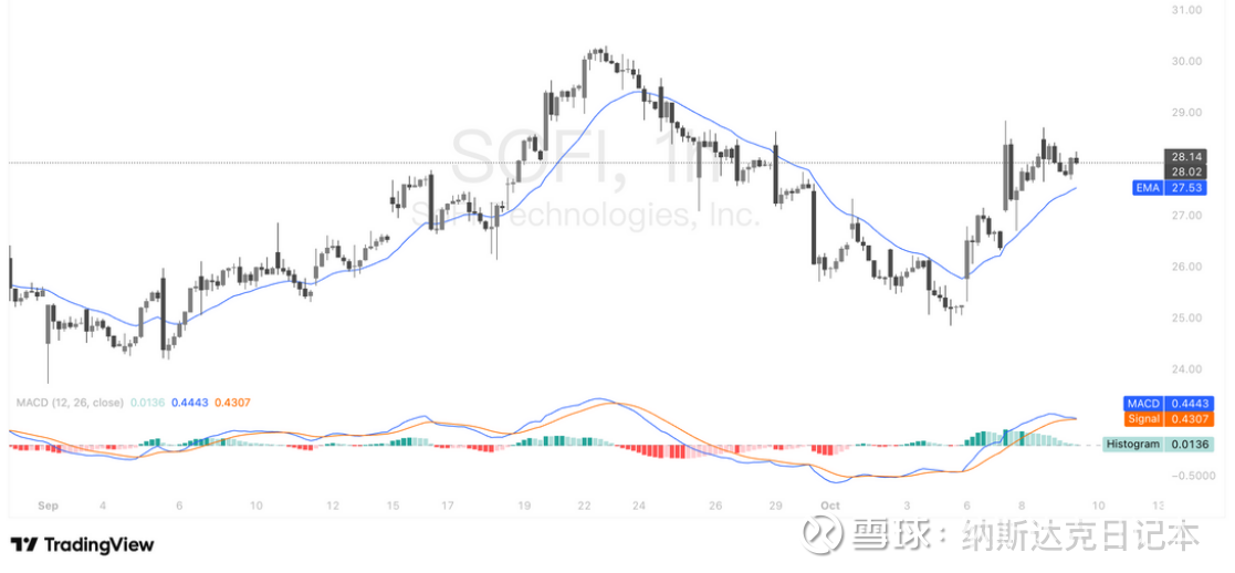 技术面来看,SOFI 股价当前处于 20 周期 EMA 上方,获均线有效支撑,且 MACD 指标呈现金叉,多头动能积聚。虽有小幅回调,但整体上涨趋势未破,后续有望延续涨势,值得关注。