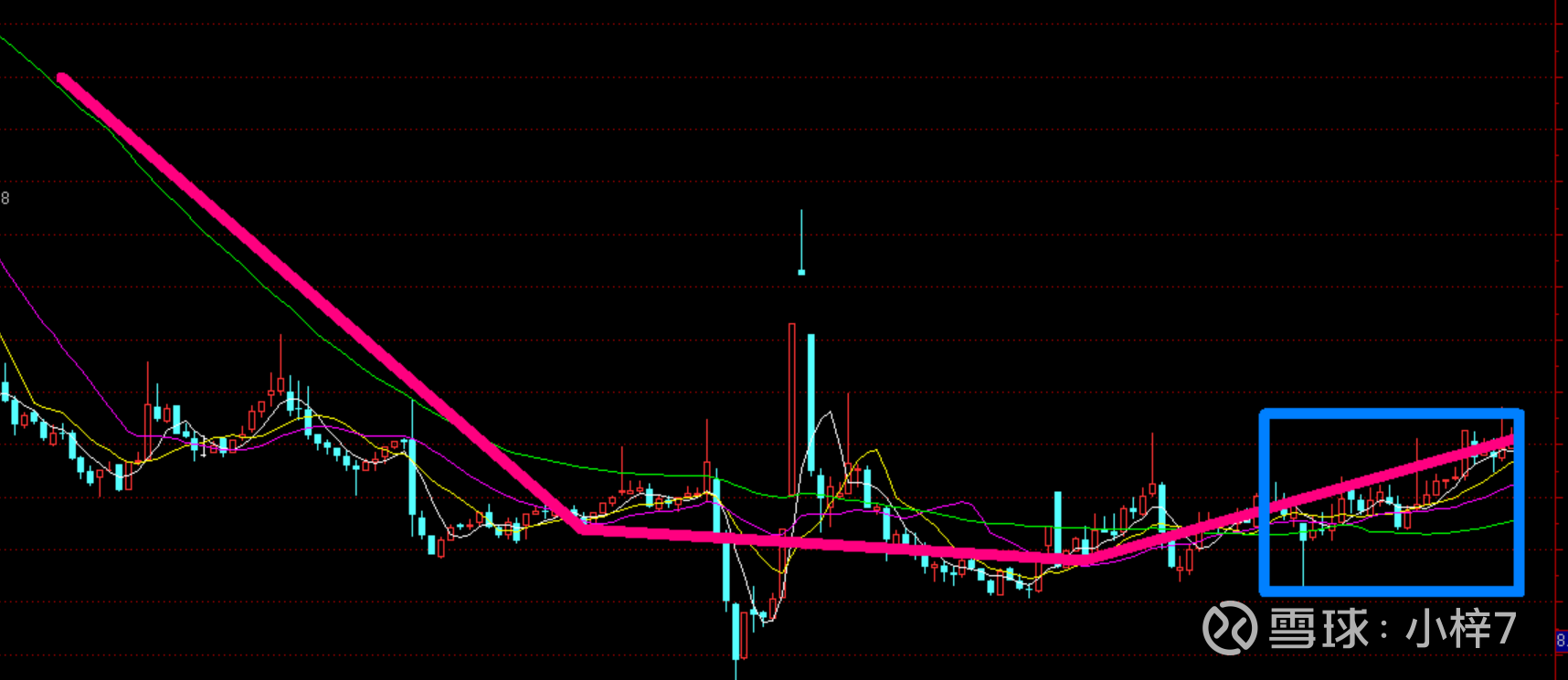 粉色的线是花生自开市以来的趋势线,从周k来看,不难看出一直处于下降趋势的“花生”,在今年4月份的时候60日线开始走出向上趋势,所以我用了三段线表示,我大致表述为下降,筑底,上升。那么显然下降区间已经在2023年末走完,筑底是2024年的时间点,当然也是结合去年9月的那波大行情从而激发了华生连板,从今年4月份开始,周K正式开始排列,也就意味着“花生”开启了上升趋势,就像我之前讲的,上升分为两个阶段,小阳后大阳。在蓝色区间是我们的上升区间,那么很明显没有出现大阳,一直是小阳小踩,那么可能有的人会说这个小阳完全比不上去年9月的那一拨八连板,其实不然,去年的八连板其实在我们的筑底区间,既然是筑底,那么拉升起来的股价由于下方没有足够的支撑自然理所应当回踩下去。而现在的区间是我们的上升区间,还是那句话,跋山涉水走出来的趋势是不会轻易被打破的。