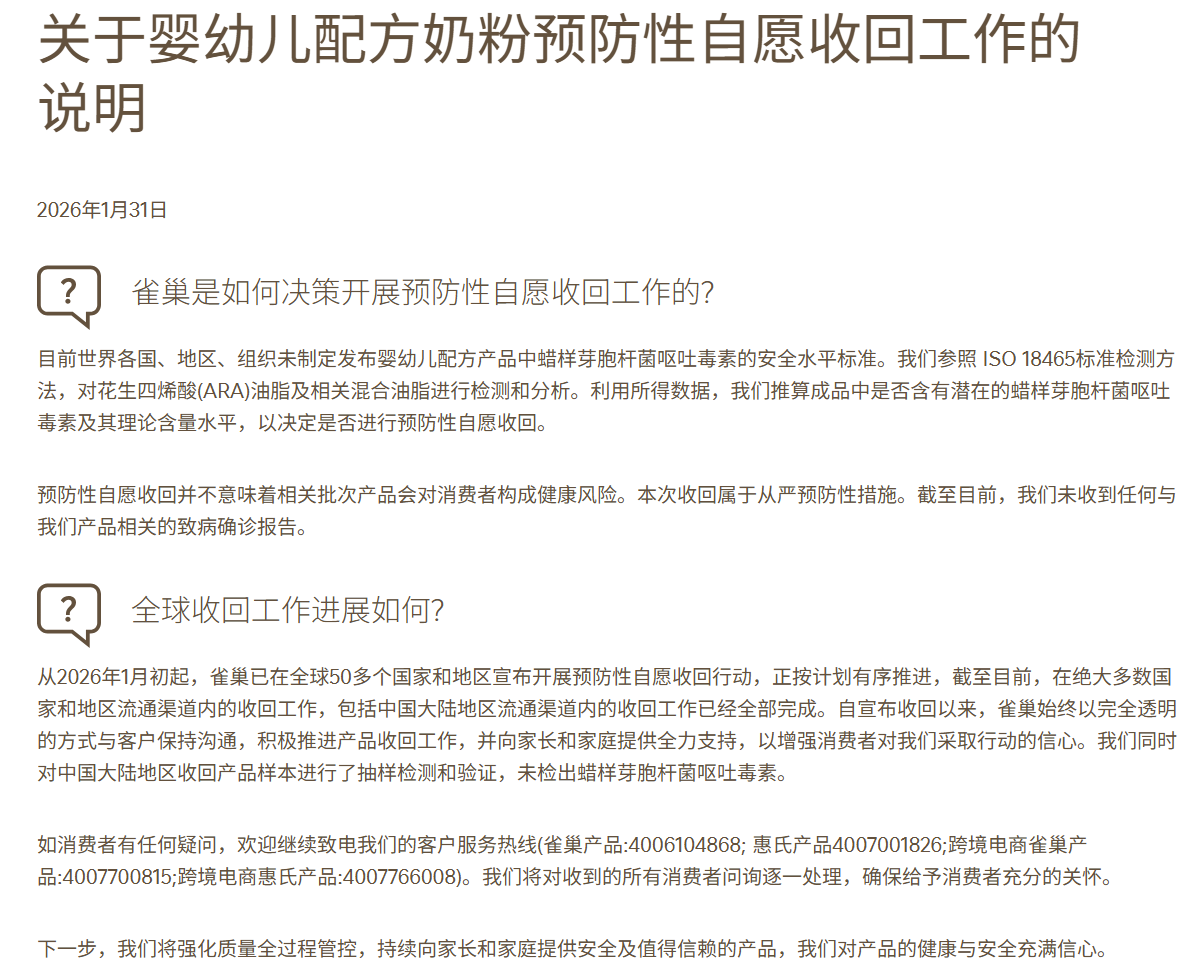 据披露,中国大陆地区的召回工作自2026年1月初启动后有序推进,目前流通渠道内涉及批次产品已全部收回。同时,雀巢对收回产品样本开展抽样检测验证,结果明确显示未检出蜡样芽胞杆菌呕吐毒素。此外,雀巢已公布多渠道客服热线,妥善回应消费者问询,并表示后续将强化质量全过程管控,持续提供安全可信的产品。