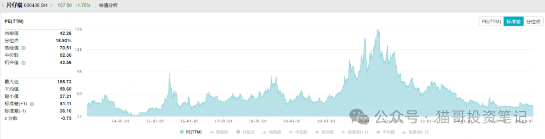 业绩下滑的情况下,片仔癀的市盈率还有42倍,2021年最高时曾达到过150倍: