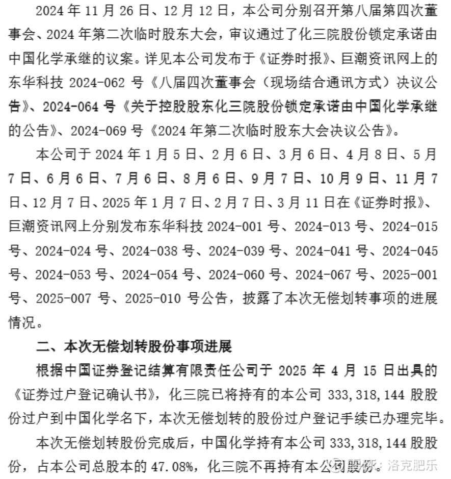 于是查与之相关的公告,2023年11月,东华科技发布公告,其控股股东化学工业第三设计院有限公司(简称“化三院”)拟将其持有的公司全部47.07%的股份,无偿划转至中国化学 。此次划转完成后,东华科技的控股股东由化三院变更为中国化学,而最终实际控制人仍为中国化学工程集团有限公司。