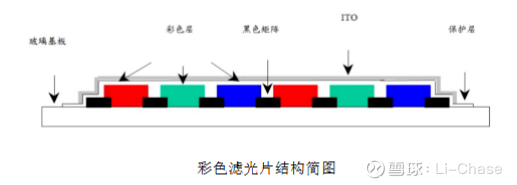 既然是彩色光刻胶,那么用于彩膜CF的制造,基本的TFT-LCD彩膜结构(这个是独立的CF,COA也差不,只不过下面是Array) 如下所示,可见在彩膜上主要用的彩色光刻胶为黑色、蓝色、绿色和红色四种,所以对应的分散液也分为四种。