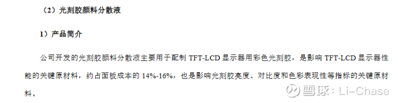 以此为基础进一步分析。部分研报和数据指出分散液占整体光刻胶重量大约在15%以上,部分甚至到40%。例如京东方2013年《颜料分散剂、颜料分散液、彩色光刻胶及其制备和应用》专利CN201310263835.1指出分散液重量占比在30.22%-70.3%。
