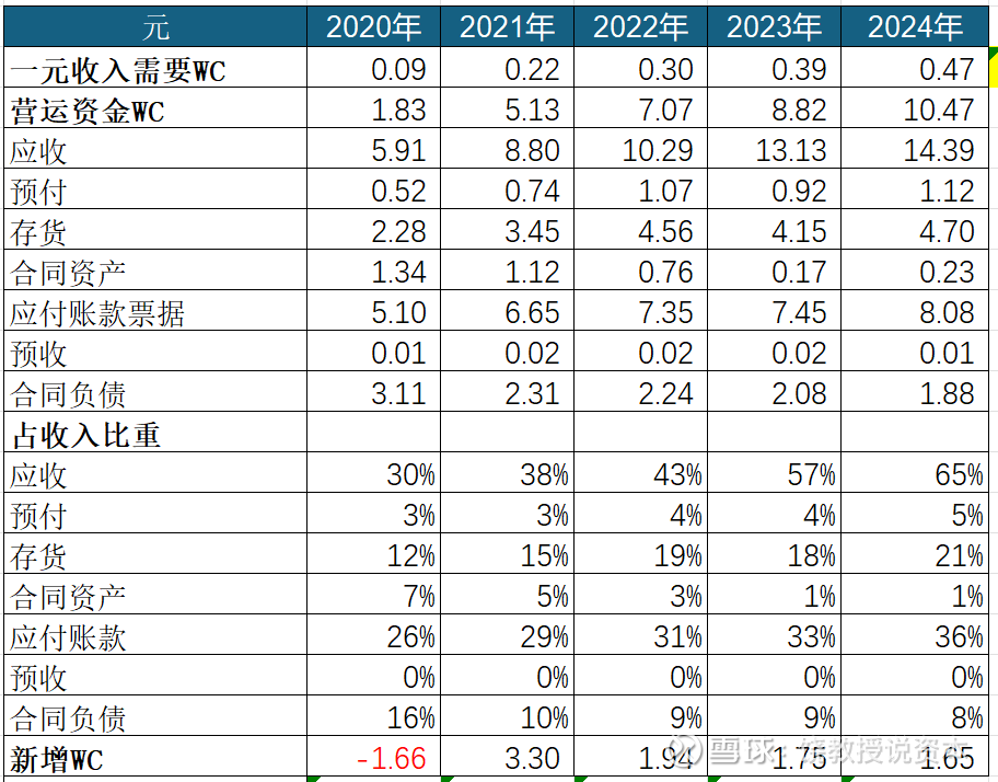 2020-2024年,一元收入需要营运资金WC从0.09上升到0.47,结果是从2021年开始,每年都要新增投入营运资金,每年新增WC都超过当年归母净利润,5年合计新增投入WC达到10.27亿,而这5年归母净利润合计只有9.53亿,赚的账面利润都不够覆盖营运资金增量,生意挺难。
