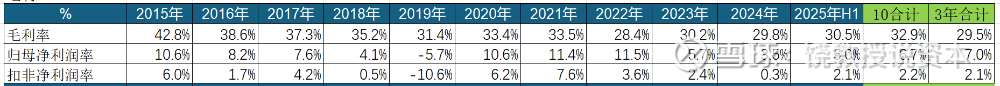 盈利能力,10年、3年综合平均毛利率32.9%、29.5%,扣非净利润率2.2%、2.1%。业务盈利能力不高。