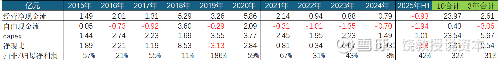 如果归母净利润和扣非净利润差不多,我们就看归母利润即可,如果差得多,说明经营活动乏力,依靠非经营利润撑门面。过去10年,3年,汉威扣非只占归母32%和31%。说明过去10年,汉威利润质量有点问题,经常需要非经常性损益来冲利润。