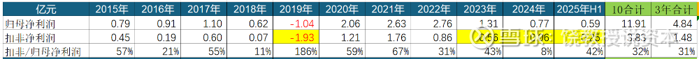归母净利润,2021年达到顶峰,也不高只有2.63亿,随后一路下滑到2024年只有0.77亿,2025年上半年0.59亿,全年分析师预期1.56亿。