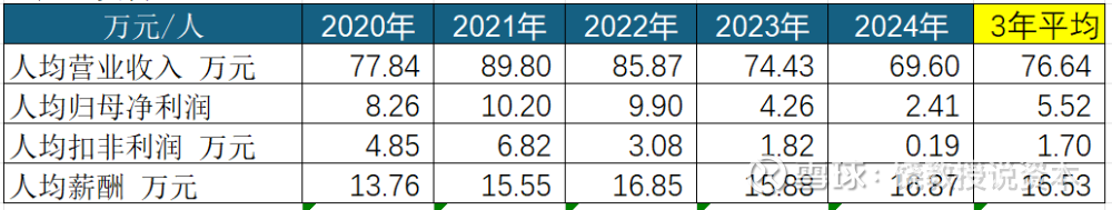 人均指标,3年平均,人均营业收入76.64万,人均扣非净利润1.7万,都非常一般,甚至不佳。人均薪酬只有16.53万元。