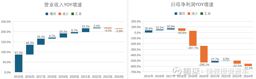 2015-2024年,营业收入和归母净利润逐年(YOY)增速,前期营收增速不错,后期增长不再。中期利润就顶不住,逐年下滑。总体印象,业务增长乏力,赚钱能力大幅下滑,似乎就是个艰难维持的状态。