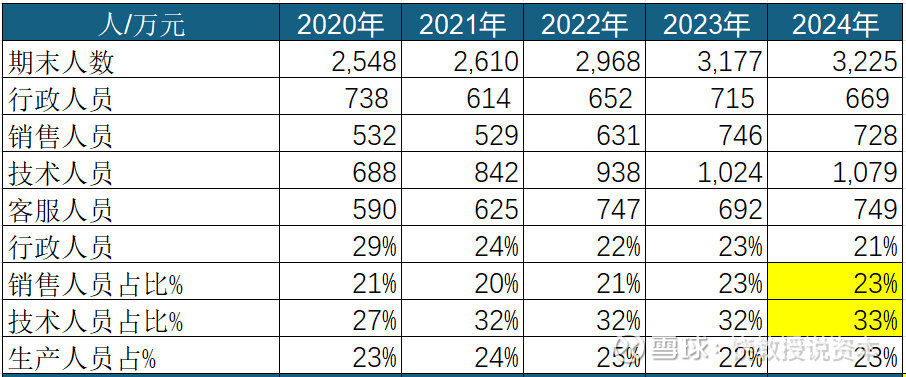 从人员结构看也挺有意思,一是技术人员占比挺高2024年达到33%,可是人均薪酬不高,似乎研发强度并不高。销售人员占比23%,TOB业务需要这么多销售?