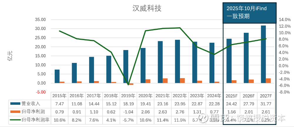 汉威科技是一家老牌上市公司,2009年首批28家创业板企业之一,成立更早1998年。过去10年的盈收规模看,2015-2018,营业收入速增长,从7.47亿涨到2018年的15.12亿。2019年-2022年,营收处于稳定,2022年营收达到23.95亿,随后营收不断下降,2024年只有22.28亿,较2022年下降7%。2025年分析师一致预期24.42亿,也是刚回到2022年的水平。