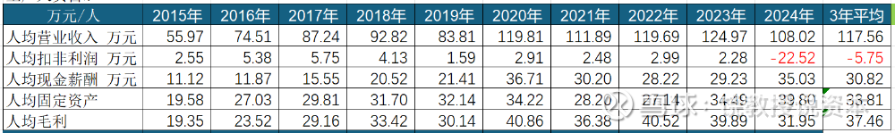 人均利润不断下降,早期规模小还有些利润,后期不断摊薄。相对应人均薪酬不断上升,2015年只有11.12万,2024年达到35.03万。