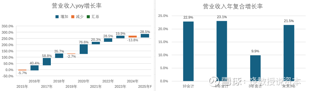 营业收入高速增长,10年(2015-2024)年复合增速22.9%,最近三年(2022-2024)复合增速9.9%,放缓,2025年预计yoy28.5%,恢复性增长,根据分析师一致预期,未来三年(2025-2027)年复合增速21.5%。